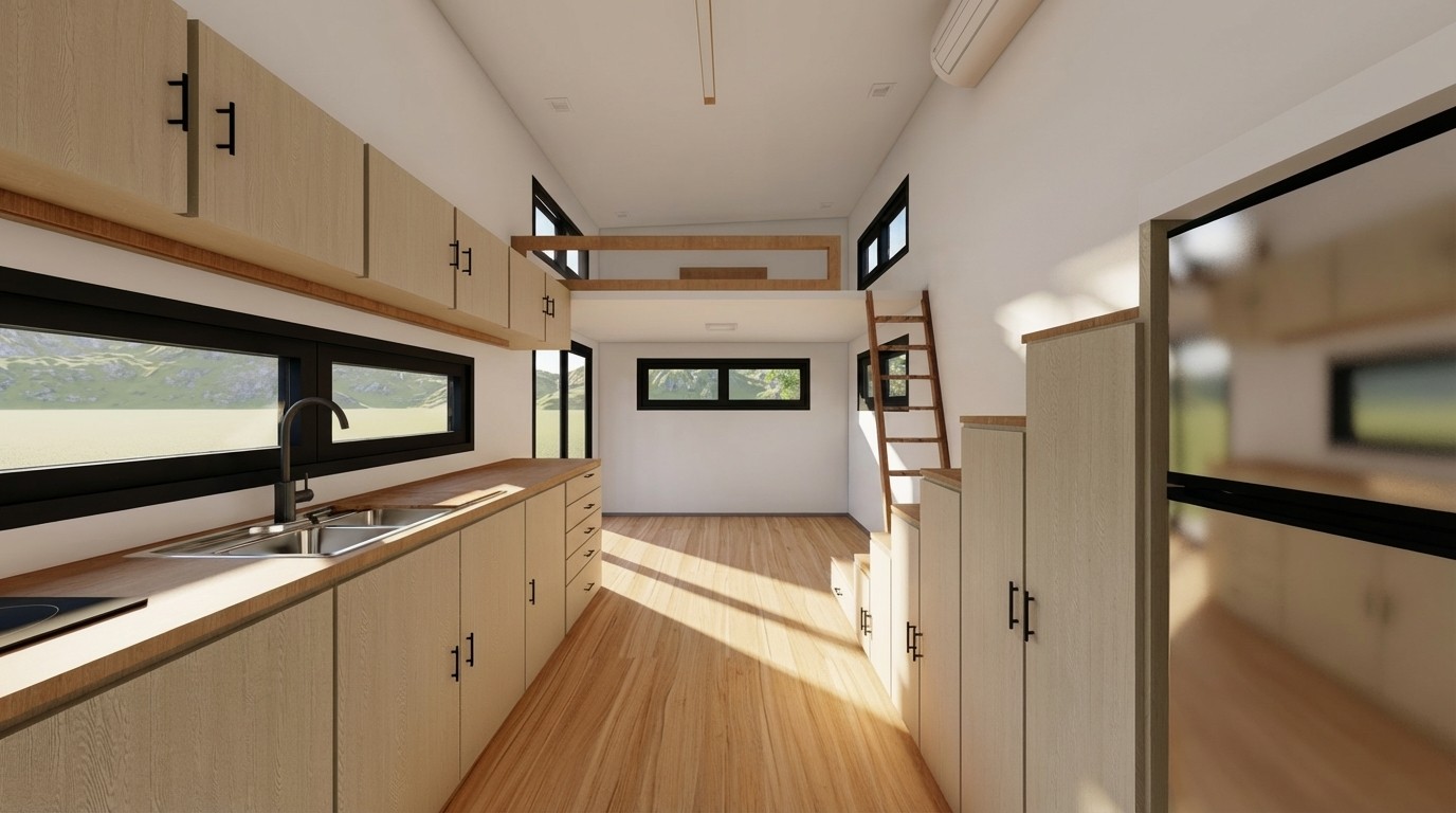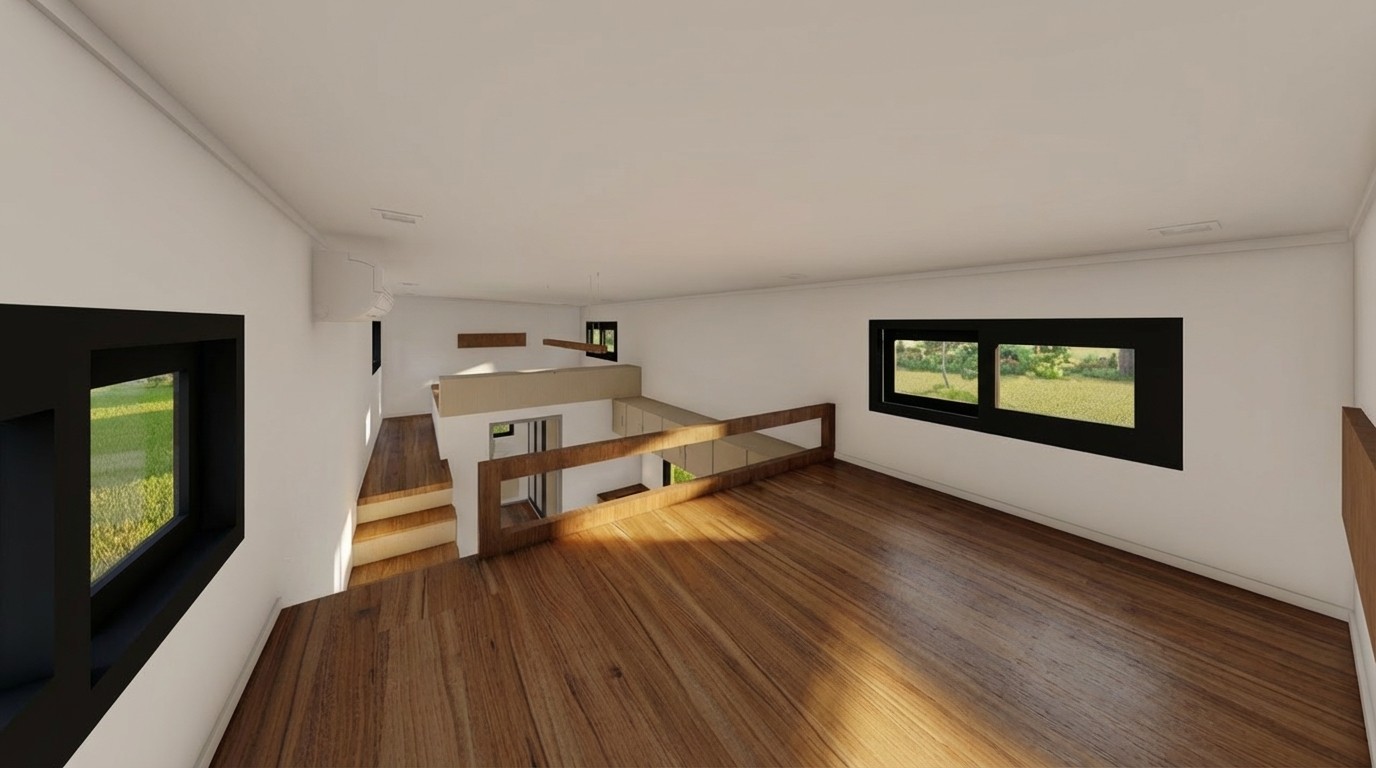 Esta sección presenta la organización espacial y el carácter arquitectónico del Modelo 2. Las imágenes permiten apreciar la distribución interior, la relación entre los espacios y la elección de materiales, mostrando con claridad el estilo, la proporción y la funcionalidad de la tiny house.