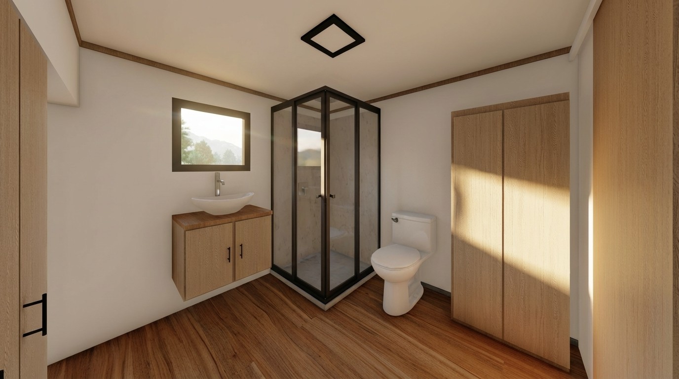 El Modelo 2 de Intiny se concibe desde la necesidad de transformar una huella compacta en una vivienda plenamente habitable. La propuesta arquitectónica desplaza el énfasis hacia el área social, generando una sala notablemente más amplia que actúa como eje del espacio interior. El baño, destacado por su tamaño, rompe con la lógica convencional de las tiny houses y aporta una sensación real de confort doméstico. La incorporación de una ventana tipo bar en la cocina, vistas abiertas y zonas definidas para almacenamiento, closet o lavandería refuerzan una experiencia cotidiana ordenada, luminosa y funcional, pensada para vivir y no solo para habitar.