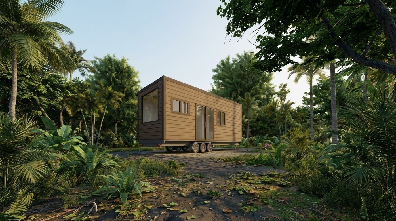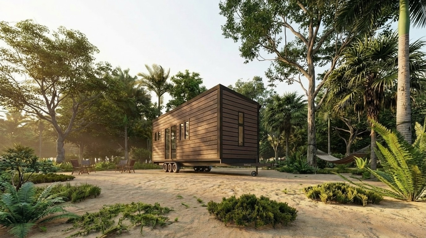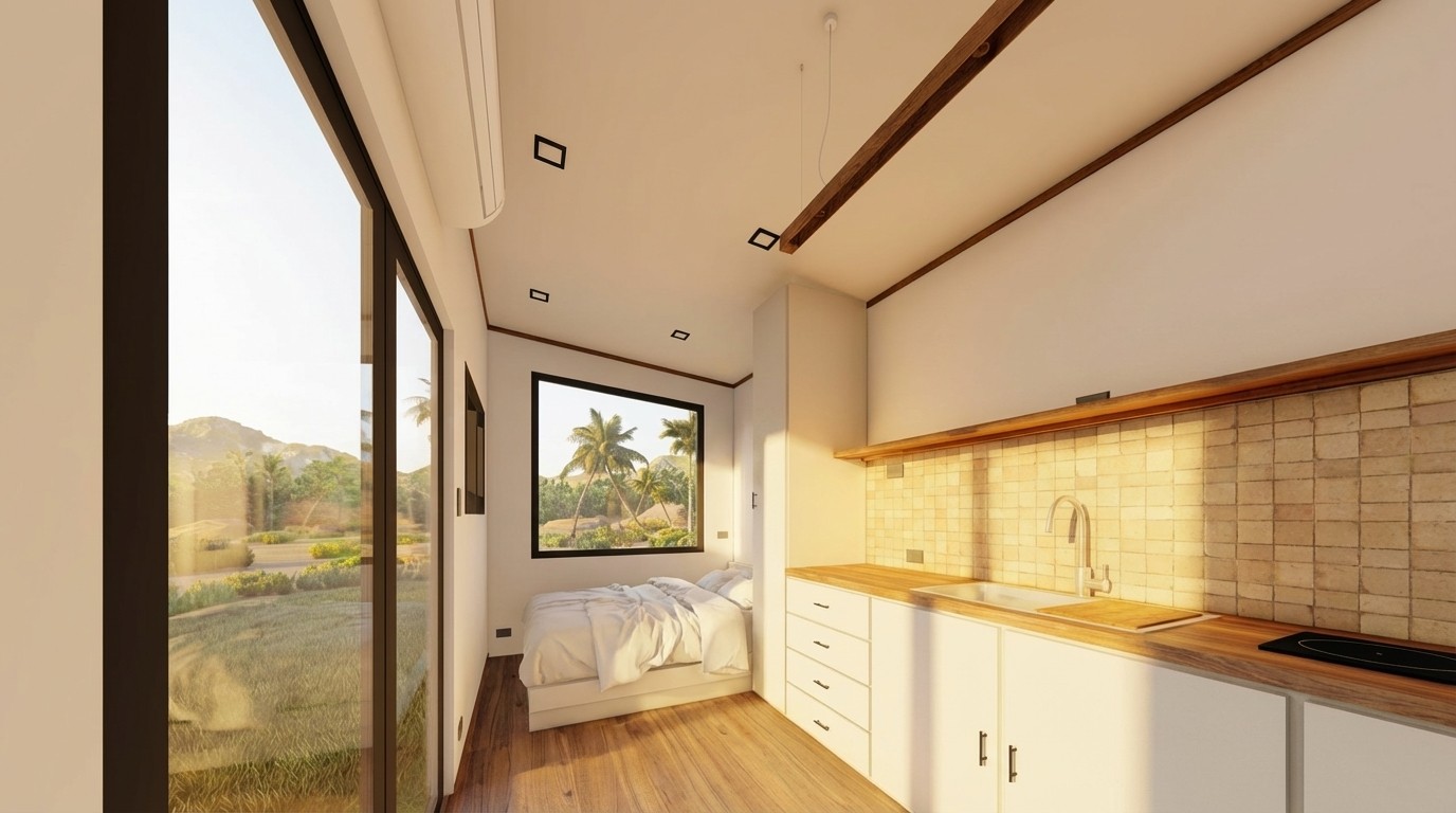 Las imágenes muestran la configuración espacial y el carácter del Modelo 3. La disposición interior, la escala del espacio y la relación directa con el exterior evidencian un diseño que prioriza la conexión con el ecosistema, integrando el paisaje como parte activa del espacio habitable. Esta aproximación refuerza una vivienda compacta orientada a la experiencia visual, la calma y el uso eficiente del espacio.