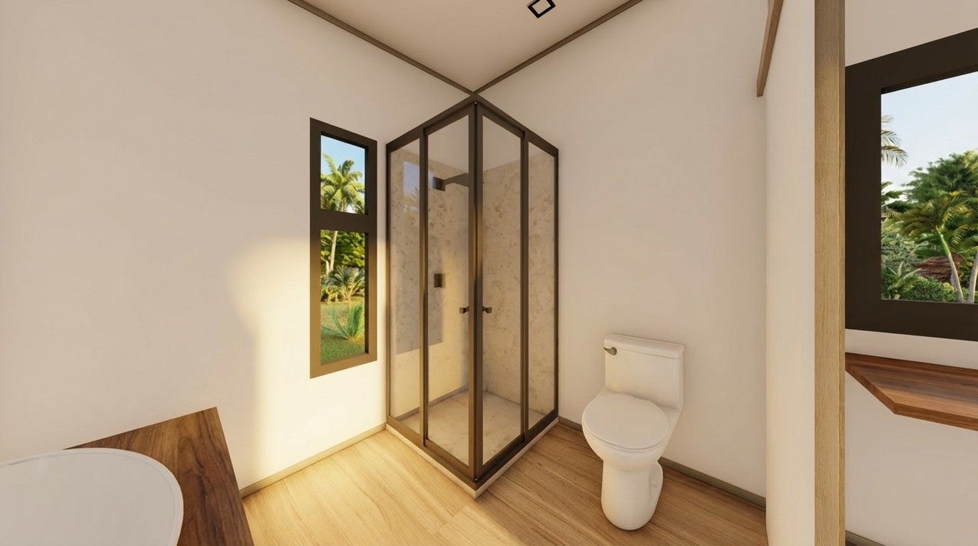 El Modelo 3 se plantea como una unidad de escala contenida, diseñada para privilegiar la relación directa con el entorno. Su organización interior responde a una lógica clara y eficiente, donde el programa se concentra en un solo nivel para favorecer la continuidad visual, el confort y la simplicidad de uso. Las aberturas amplias y las vistas panorámicas se convierten en el eje del proyecto, integrando el paisaje como parte activa del espacio habitable y reforzando su carácter de refugio.
