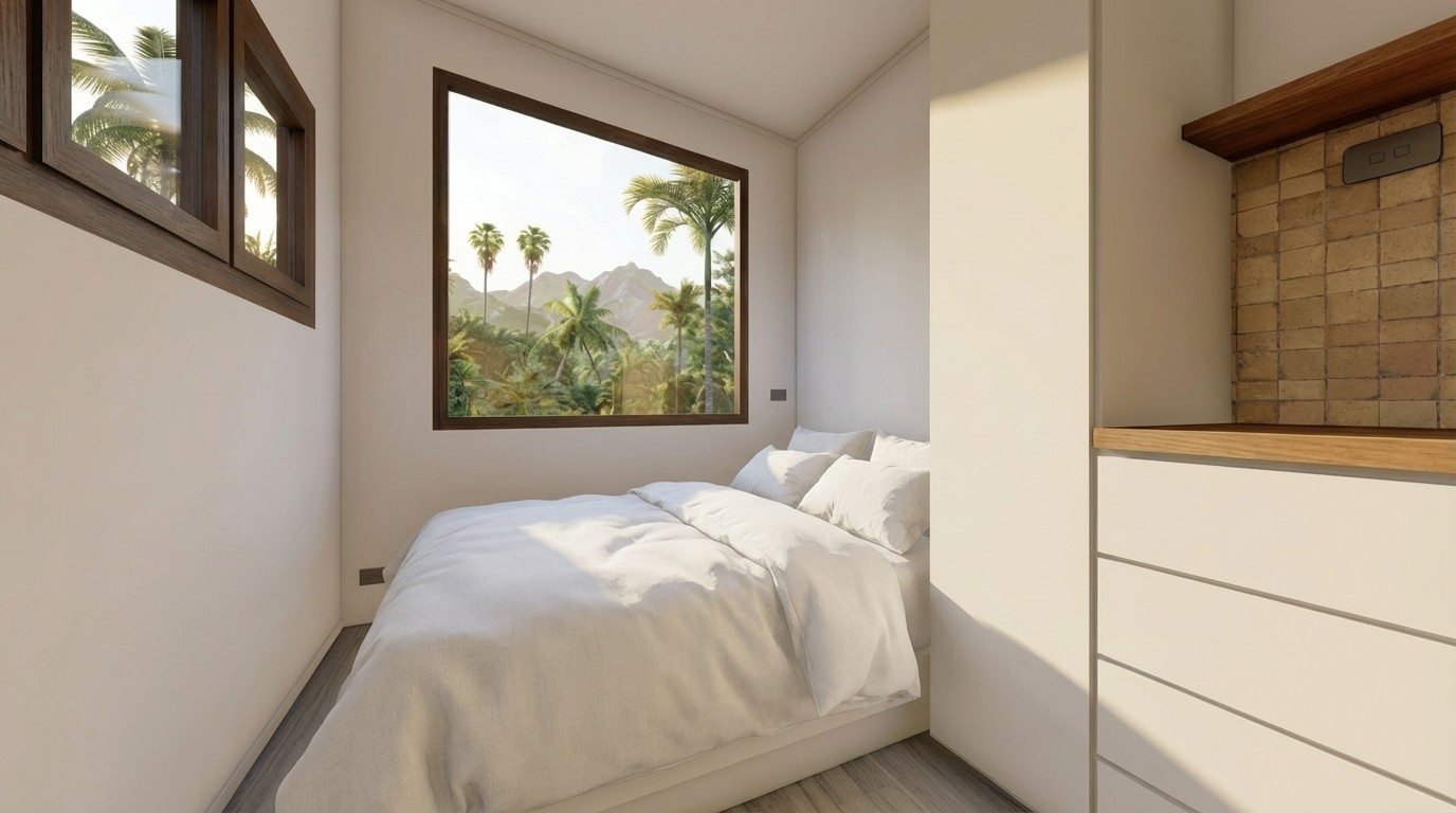 El diseño del Modelo 3 incorpora el paisaje como parte del espacio interior. La gran ventana del dormitorio establece una relación directa con el exterior, permitiendo que la luz natural y las visuales panorámicas definan la experiencia de descanso. Esta apertura transforma el interior en un punto de observación del entorno, reforzando el carácter contemplativo y sereno de la vivienda.